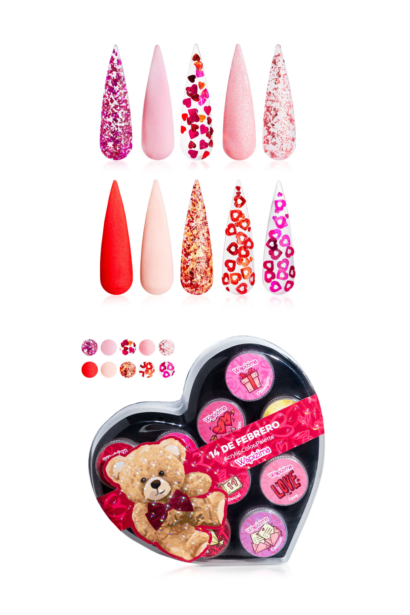 Presentamos nuestras Colecciones de 10 Piezas Edición Especial, diseñadas para llevar tu nail art al siguiente nivel. Cada colección incluye diez colores de acrílico, así como una presentación única (estuche de corazón) algunos de los cuales contienen decoraciones con acrílicos diferentes, ofreciendo un toque exclusivo y único a tus uñas.